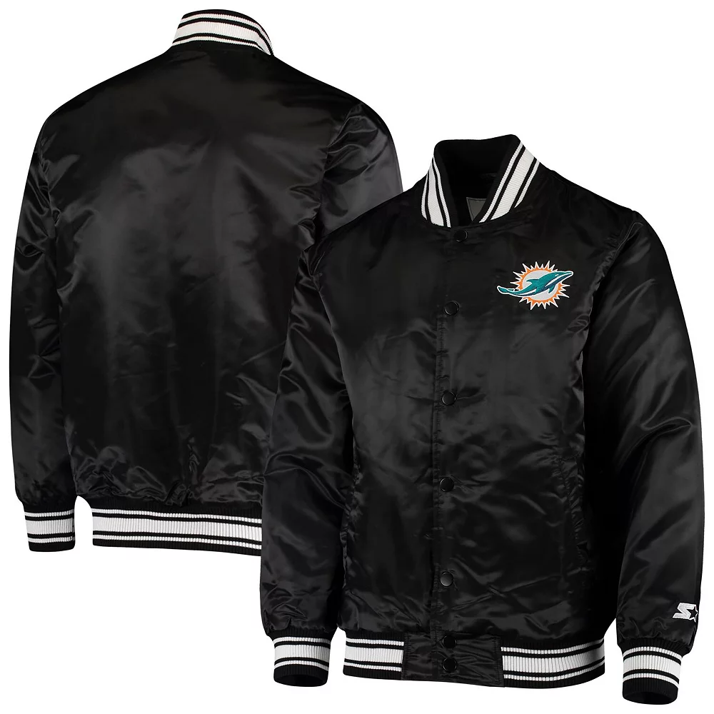 You love to add your Miami Dolphins fandom to any look, even if the weather starts to cool. Turn heads with this classic Locker Room Satin Varsity full-snap jacket from Starter. With embroidered Miami Dolphins graphics and a full-snap design, this striking jacket will become your go-to anytime you step out.