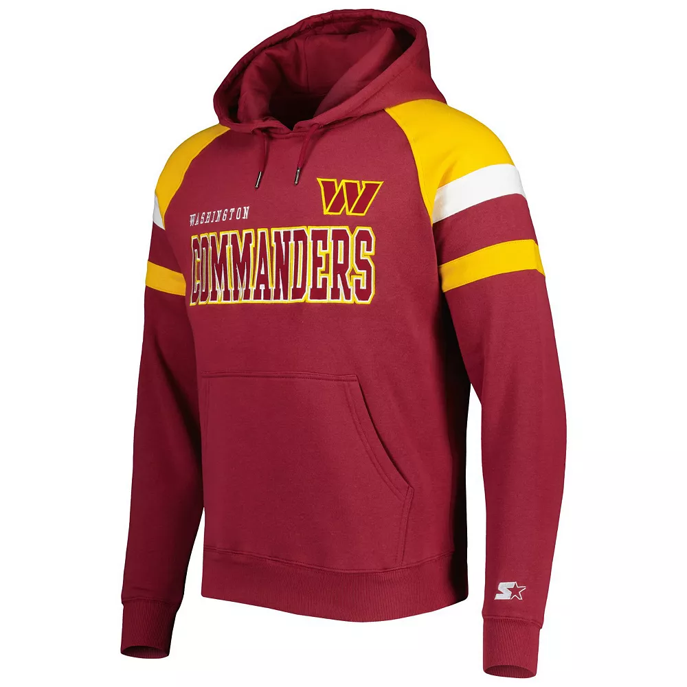 When the temperature drops, layer up on game day with this Washington Commanders Draft pullover hoodie from Starter. The fleece lining adds extra warmth, and the raglan sleeves offer increased mobility. Best of all, the embroidered graphics and sewn-on stripes add extra flair to your Washington Commanders wardrobe.