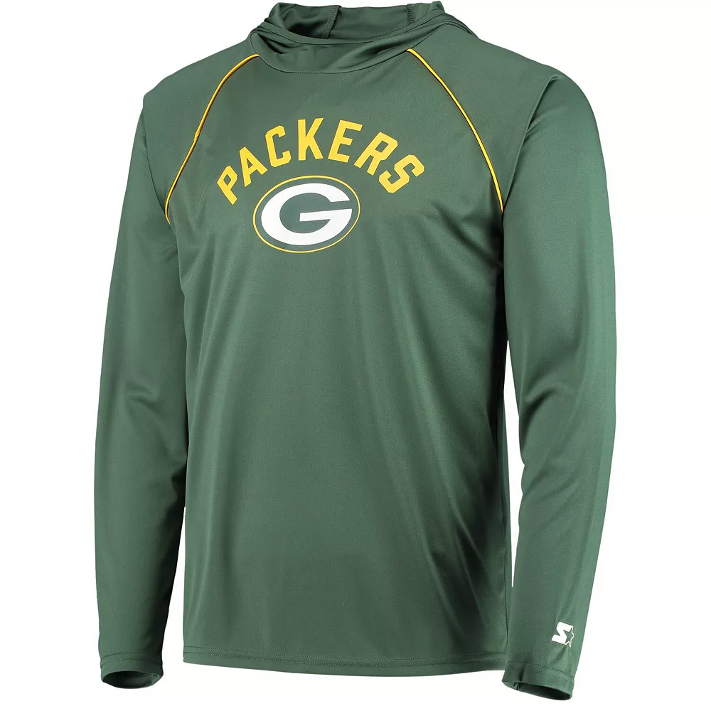 Add an extra touch of comfort to your typical tee by wearing this Green Bay Packers Hoodie T-shirt from Starter. It features noticeable Green Bay Packers graphics printed across the front. Raglan sleeves embellished with contrast-color piping finish off the look.