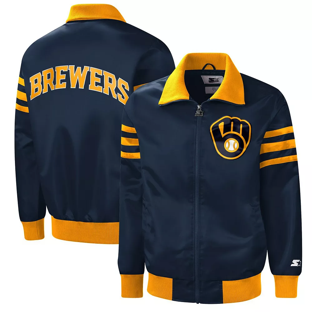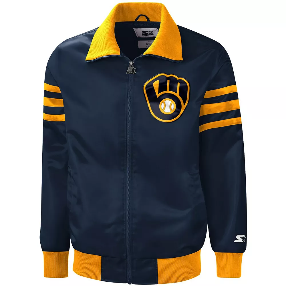 For a bold display of Milwaukee Brewers loyalty, The Captain II jacket from Starter leads the way. The embroidered Milwaukee Brewers appliques on the front and back are accentuated by stripes in a contrasting team color. Adding in glossy satin fabric and a classic varsity design, this full-zip jacket puts all eyes on your undeniable fandom.