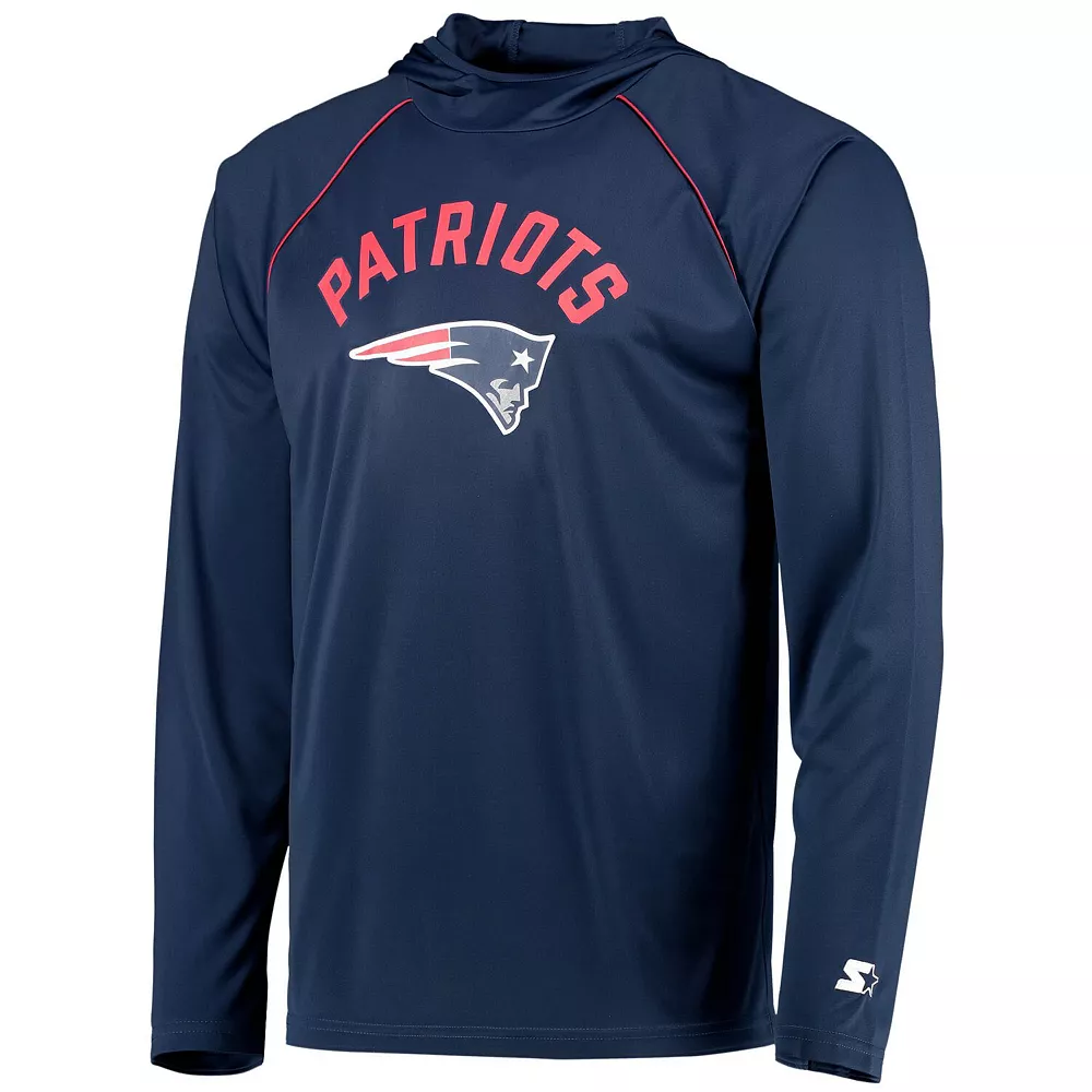 Add an extra touch of comfort to your typical tee by wearing this New England Patriots Hoodie T-shirt from Starter. It features noticeable New England Patriots graphics printed across the front. Raglan sleeves embellished with contrast-color piping finish off the look.