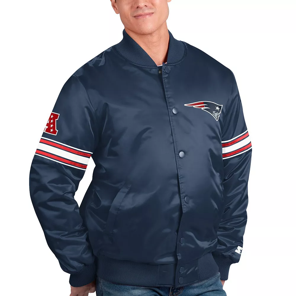Get ready for New England Patriots game day with this The Pick and Roll full-snap jacket from Starter. It features embroidered team graphics on the chest and the back, as well as contrast, team-colored stripes on the sleeves. The elastic cuffs and hem ensure you’ll be able to maintain your desired fit while you cheer on the New England Patriots.