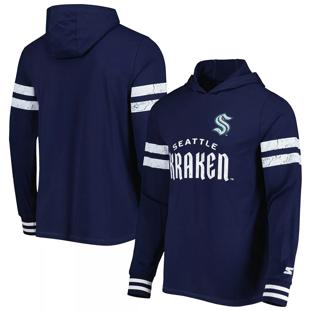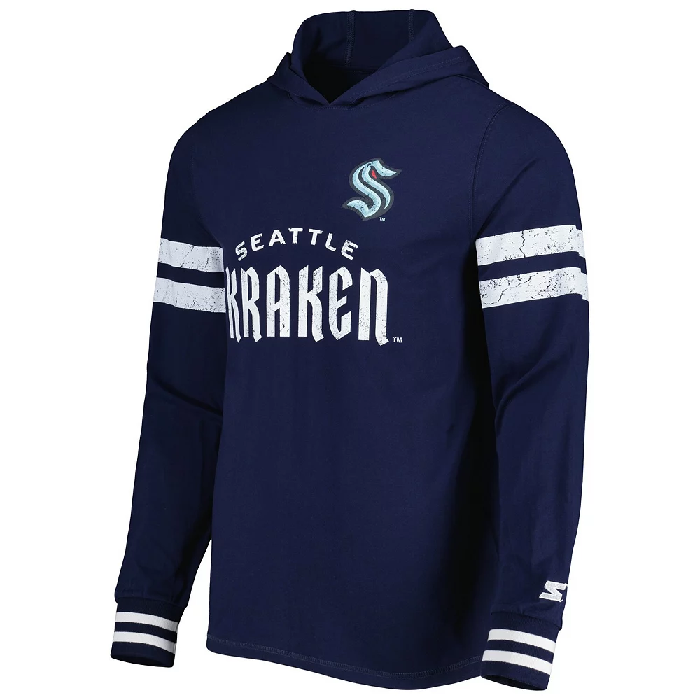 Solidify your rotation of official Seattle Kraken apparel with this Offense T-shirt from Starter. It features distressed team graphics on the front, as well as sewn-on stripes on the sleeves, giving this top a vintage look that will be the envy of fellow fans. The hood is sure to keep you warm and protected while you cheer on the Seattle Kraken.