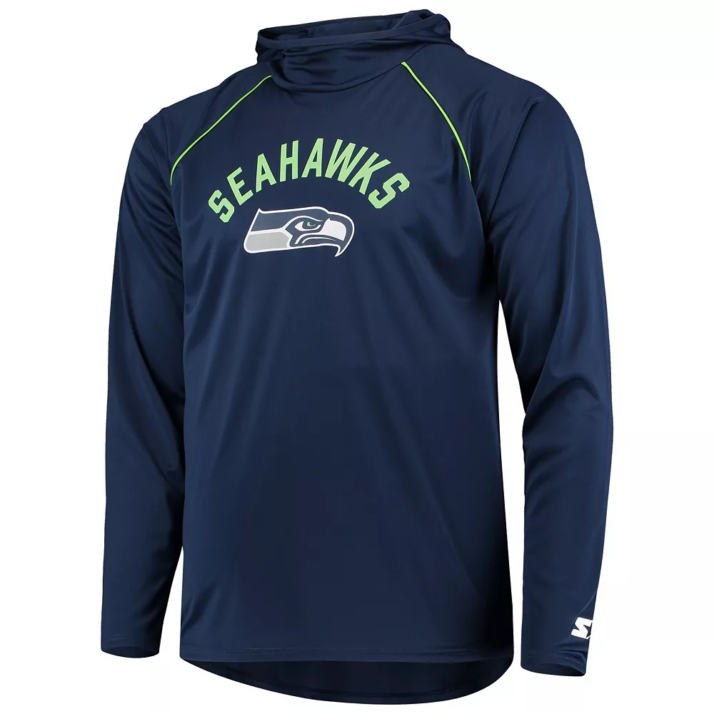 Add an extra touch of comfort to your typical tee by wearing this Seattle Seahawks Hoodie T-shirt from Starter. It features noticeable Seattle Seahawks graphics printed across the front. Raglan sleeves embellished with contrast-color piping finish off the look.
