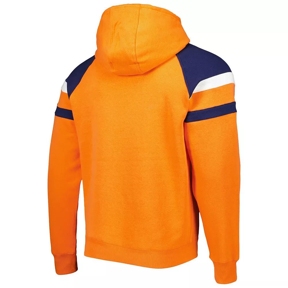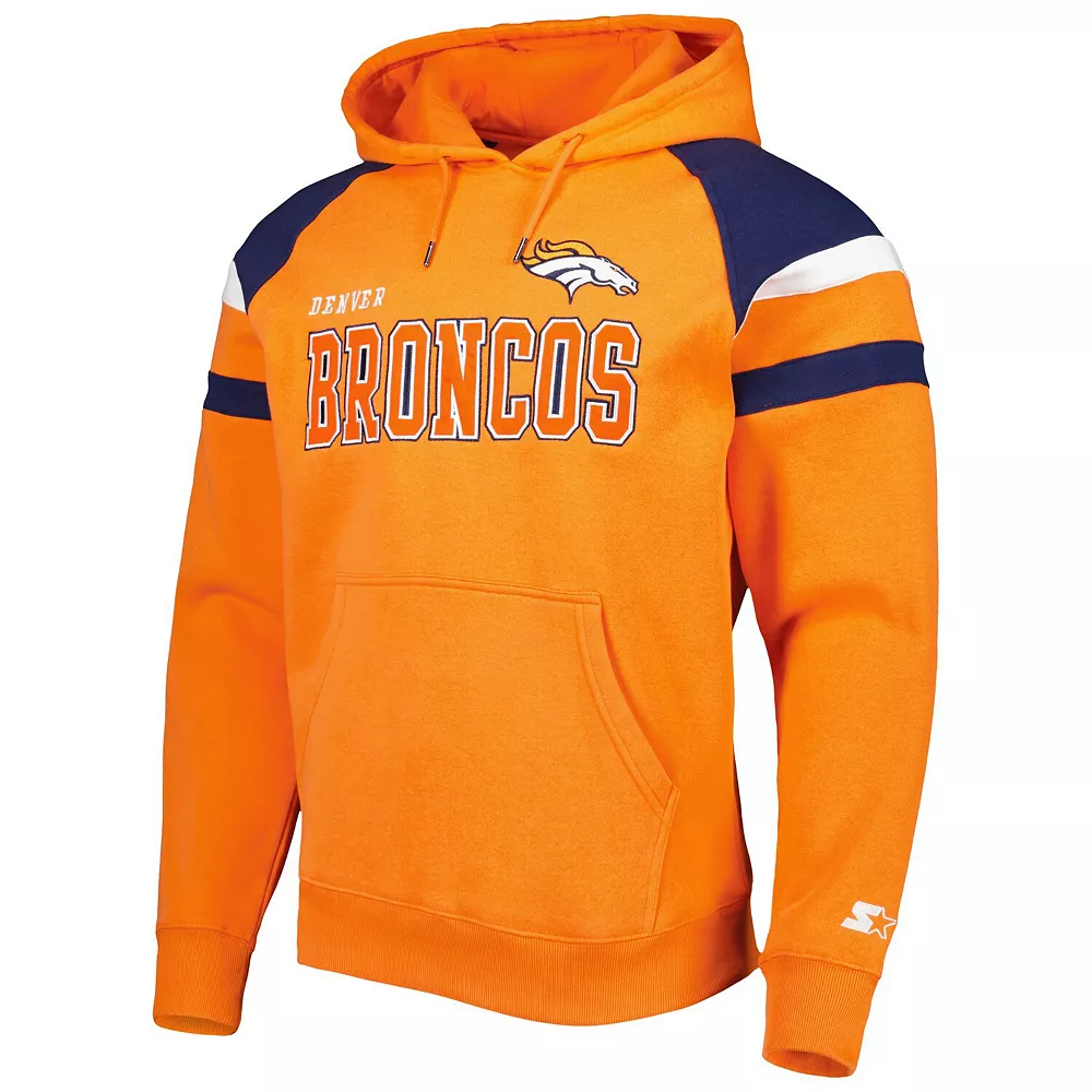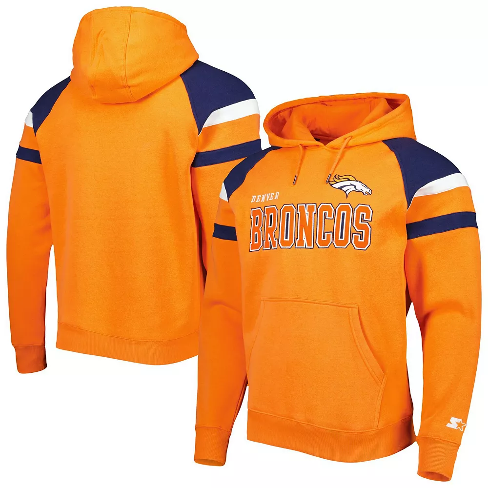When the temperature drops, layer up on game day with this Denver Broncos Draft pullover hoodie from Starter. The fleece lining adds extra warmth, and the raglan sleeves offer increased mobility. Best of all, the embroidered graphics and sewn-on stripes add extra flair to your Denver Broncos wardrobe.
