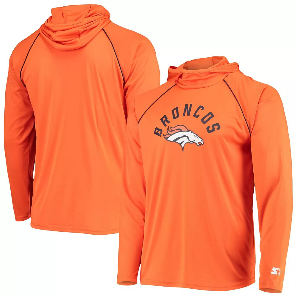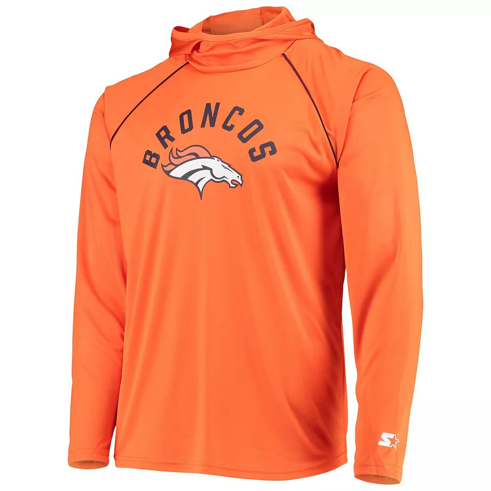 Add an extra touch of comfort to your typical tee by wearing this Denver Broncos Hoodie T-shirt from Starter. It features noticeable Denver Broncos graphics printed across the front. Raglan sleeves set with contrast-color piping finish off the look and emphasize your favorite team.