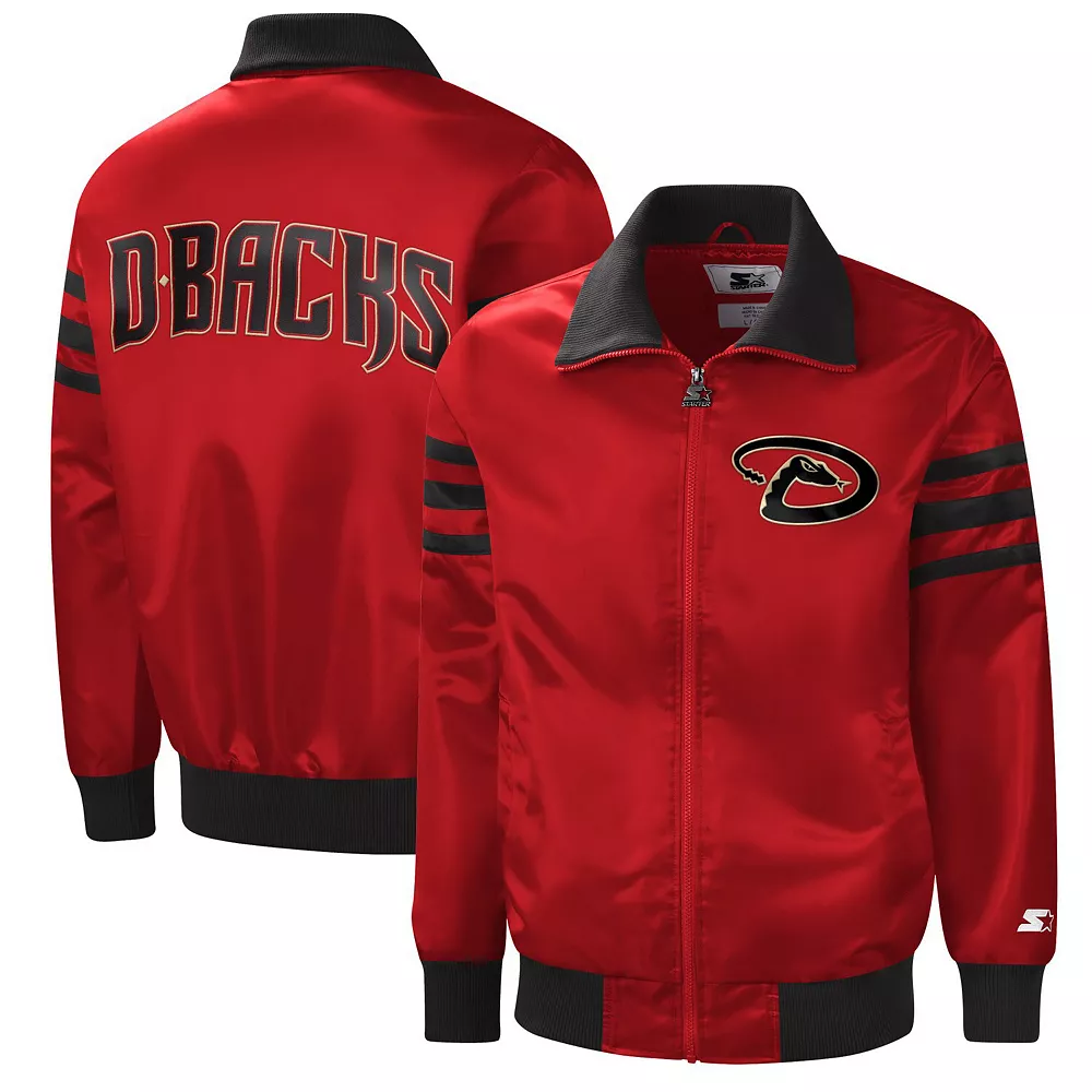 For a bold display of Arizona Diamondbacks loyalty, The Captain II jacket from Starter leads the way. The embroidered Arizona Diamondbacks appliques on the front and back are accentuated by stripes in a contrasting team color. Adding in glossy satin fabric and a classic varsity design, this full-zip jacket puts all eyes on your undeniable fandom.