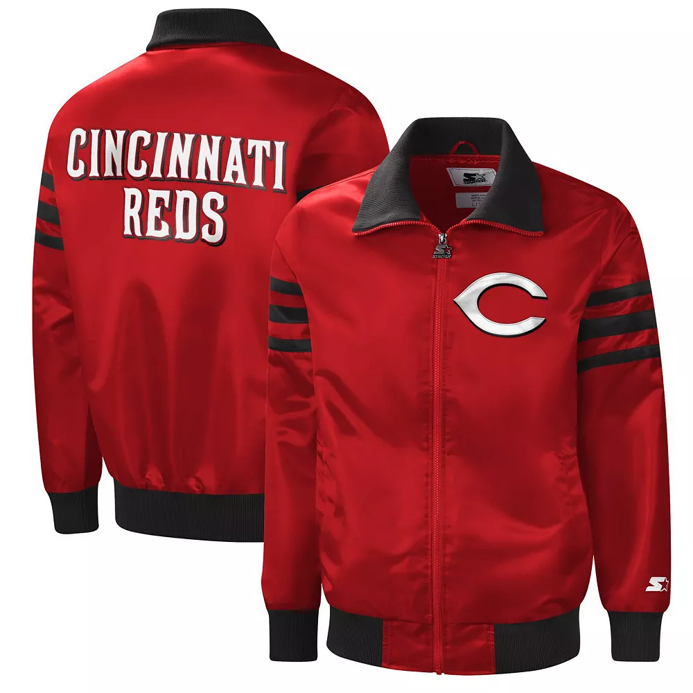 For a bold display of Cincinnati Reds loyalty, The Captain II jacket from Starter leads the way. The embroidered Cincinnati Reds appliques on the front and back are accentuated by stripes in a contrasting team color. Adding in glossy satin fabric and a classic varsity design, this full-zip jacket puts all eyes on your undeniable fandom.