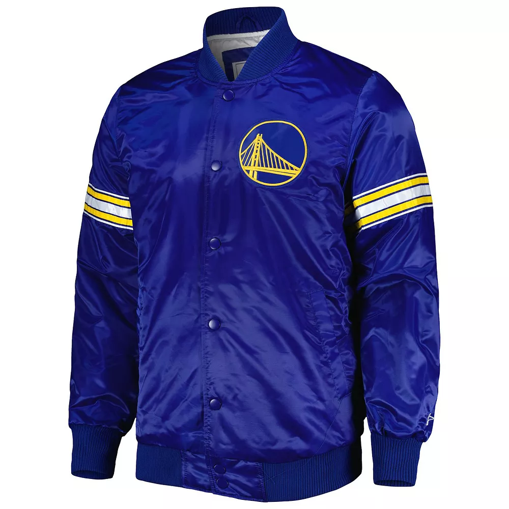 Make sure no one forgets how passionate you are about the Golden State Warriors by sporting this Starter Pick and Roll jacket. It features a classic Varsity design with its satin finish and signature Golden State Warriors graphics. The full-snap front allows you to wear it open or closed for a versatile display of team spirit.