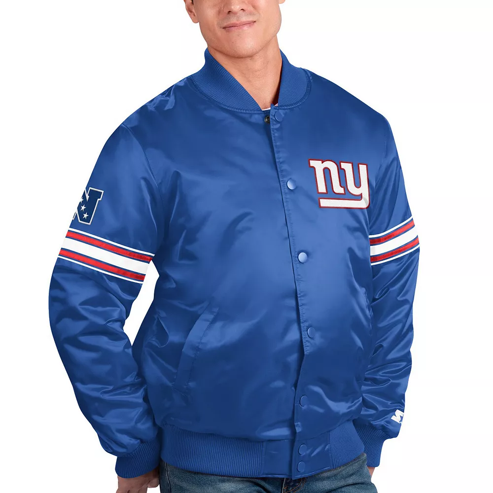 Get ready for New York Giants game day with this The Pick and Roll full-snap jacket from Starter. It features embroidered team graphics on the chest and the back, as well as contrast, team-colored stripes on the sleeves. The elastic cuffs and hem ensure you’ll be able to maintain your desired fit while you cheer on the New York Giants.