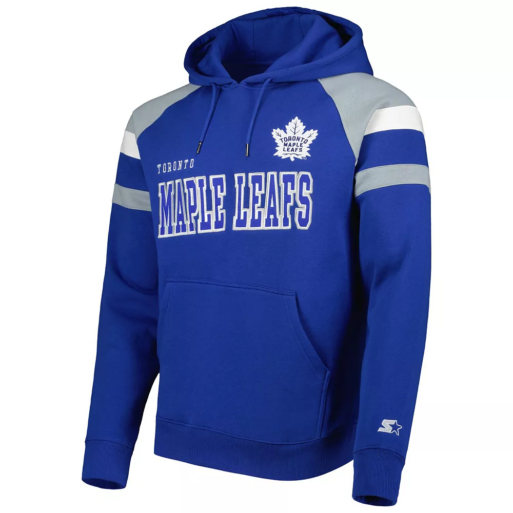 When the temperature drops, layer up on game day with this Toronto Maple Leafs Draft pullover hoodie from Starter. The fleece lining adds extra warmth, and the raglan sleeves offer increased mobility. The embroidered graphics and sewn-on stripes add extra flair to your Toronto Maple Leafs wardrobe.