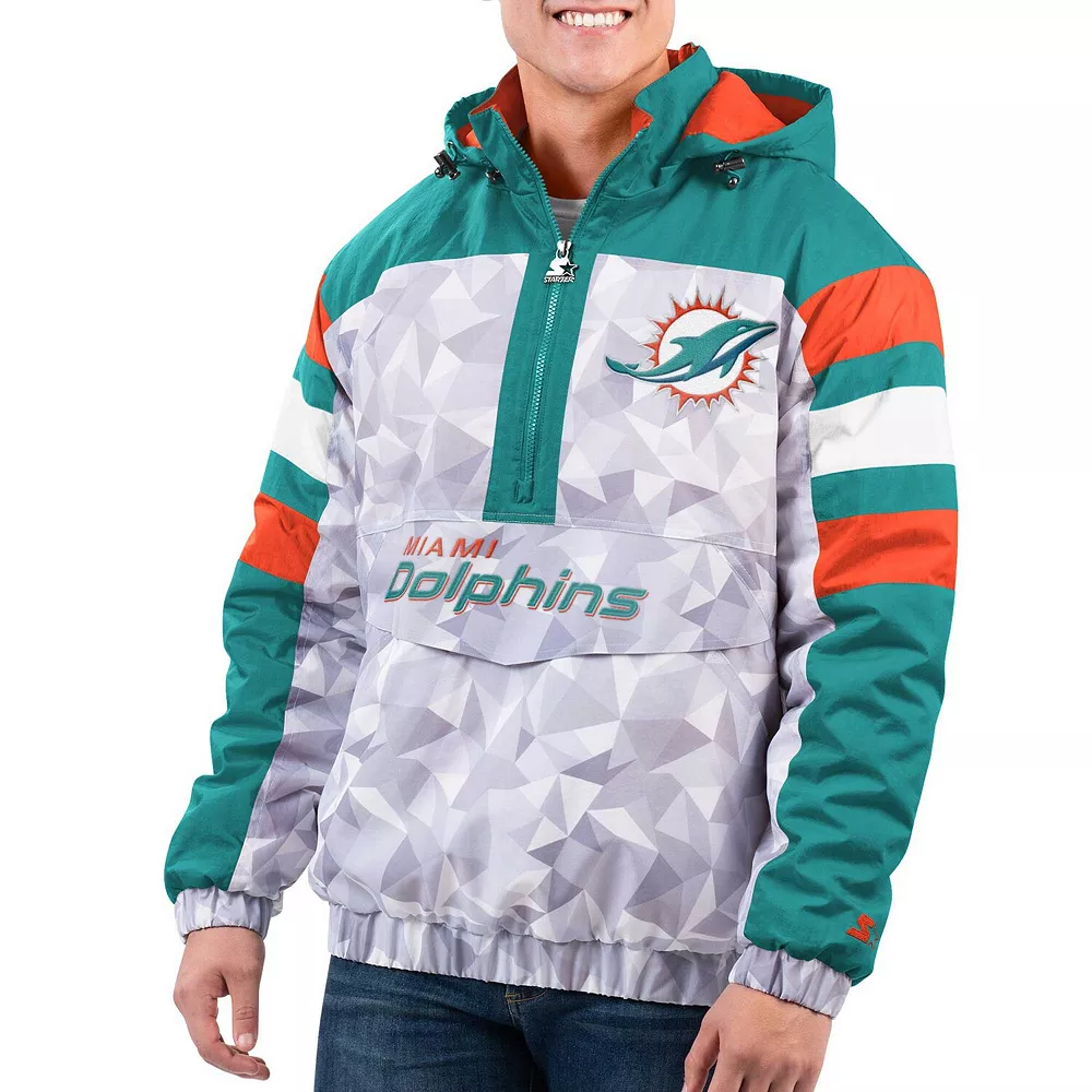Show your Miami Dolphins fandom in any weather with this Thursday Night Gridiron jacket from Starter. The bold graphics and covered front pocket make this jacket both functional and fashionable. The rain-resistant fabric and detachable hood with adjustable toggles ensure that you’re protected from the elements while cheering your Miami Dolphins to victory.